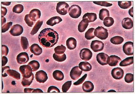 Нарушение функций молекул гемоглобина в крови вызывает анемию. Эти клетки крови, увеличенные в 900раз, взяты у человека, имеющего серповидно-клеточную аномалию эритроцитов.