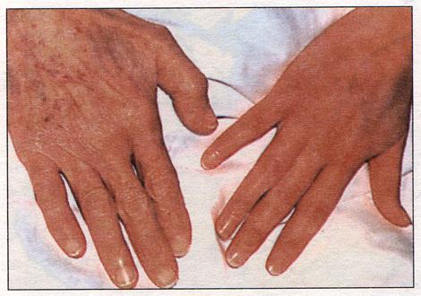 Мертвенно-бледная рука пациента, страдающего железодефицитной анемией (слева) и нормальная рука здоровой женщины.