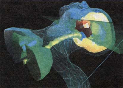 Здесь изображена радиотерапия при раке. Коричневая область - это опухоль, зеленый конус - облучение.