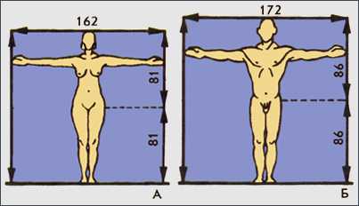 Биотип женщины (а) и мужчины (б) по Ж. Декеру и Ж. Думику. Длина верхней части тела равна длине нижней. Размах рук равен длине тела. |