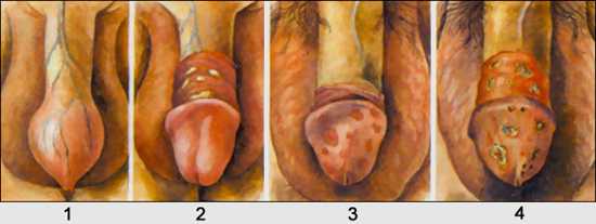 Баланопостит при наличии фимоза (1) и в форме гиперемии головки полового члена и внутреннего листка крайней плоти (2) у ребенка трихомонадный (3) и гангренозный (4) у мужчины |