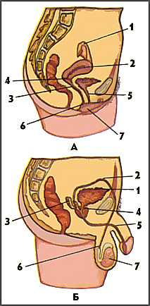 А. У женщин: 1 - фаллопиева труба, 2 - матка; 3-шейка матки; 4 - перешеек матки; 5 - мочеиспускательный канал; 6- влагалище; 7 - малые половые губы. 7 - яичко Б. У мужчин:1 - мочевой пузырь; 2 - семявыводящий проток; 3 - семенной пузырёк, 4 - предстательная железа; 5 - мочеиспускательный канал; 6 - придаток яичка; 7 - яичко |