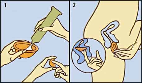 Введение влагалищного колпачка:1-смазывание поверхности колпачка противозачаточной пастой;2-введение колпачка. |