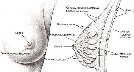 Молочная железа состоит из 15-20 долек с выводными протоками (молочные ходы), открывающимися на вершине соска. Каждый молочный проток перед выходом на поверхность соска под околососковым кружком образует расширение, в котором накапливается молоко. Сосок и околососковый кружок (ареола) покрыты нежной морщинистой пигментированной кожей. Форма и величина соска у каждой женщины различны, преимущественно он цилиндрический или конический, иногда плоский и вытянутый, что затрудняет процесс кормления ребёнка грудью.