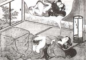 Гравюра Харунобу (конец 1760-х гг.) изображает молодую женщину, которая мастурбирует, фантазируя о свидании со своим возлюбленным.