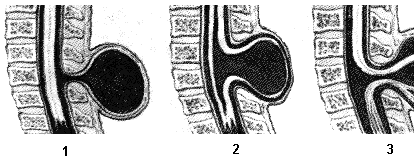 Рис.1. Спиномозговаые грыжи: 1 - менингоцеле; 2 - миелоцеле; 3 -