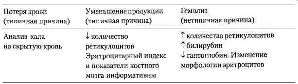 Кровопотеря: травма, кровотечение из ЖКТ (может быть скрытым); менее типичны урогенитальные источники (меноррагия, значительная гематурия), внутреннее - ретроперитонеальное кровотечение в подвздошно-поясничную область (при переломе бедра). Острое кровотечение сочетается с проявлениями гиповолемии, ретикулоцитозом, макроцитозом; хроническое кровотечение связано с дефицитом железа, гипохромией, микроцитозом.