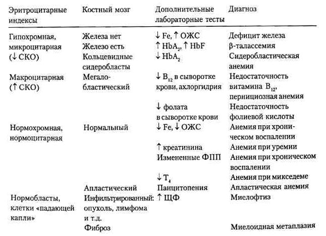 Макроцитарные анемии: 1) хронические заболевания печени (цирроз, хронический гепатит); 2) алкоголизм; 3) гипотиреоз (анемия может быть и нормоцитарной); 4) мегалобластические анемии (недостаточность витамина В12, фолата); 5) миелодисплазия (гл. 140).