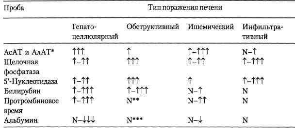Аминотрансферазы. Аспартатаминотрансфераза (АсАТ) и аланинаминотранс-фераза (АлАТ) - чувствительные индикаторы целости клеток печени, их наибольший подъем происходит при некрозе клеток печени (вирусный гепатит, токсическое поражение печени, циркуляторный коллапс, острая обструкция печеночных вен), иногда при внезапной обструкции желчных путей (камень); активность аминотранс-фераз слабо коррелирует с тяжестью болезни; меньшие отклонения отмечены при холестатическом, цирротическом и инфильтративном процессах; АлАТ более специфична для поражения печени, в то время как АсАТ обнаруживается и в скелетной мускулатуре; алкогольное поражение печени ведет к умеренному повышению АсАТ в большей степени, чем АлАТ.