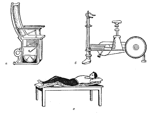 Общая вибрация производится с помощью таких аппаратов, как вибрационный стул (рис. 5, а), в котором колебательные движения создаются при помощи электромотора. Кроме того, в массажной практике применяются вибрационная кушетка (рис. 5, в), велотраб Гоффа (рис. 5, б), различные массажные кресла. С помощью массажного кресла и вибрационной кушетки можно провести и локальный массаж, включив для этого только нужную часть данного аппарата.