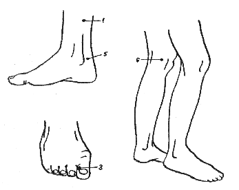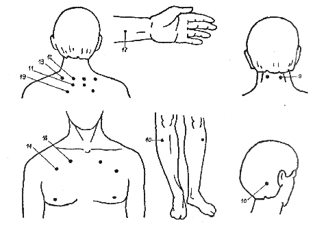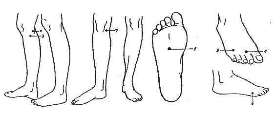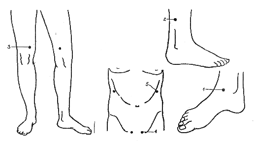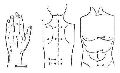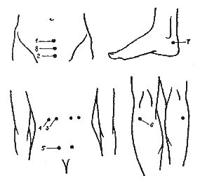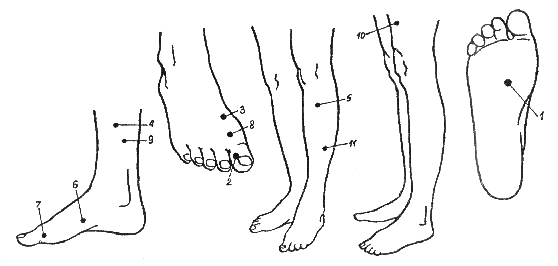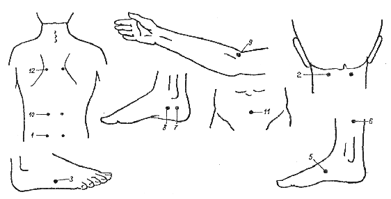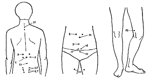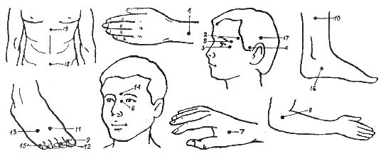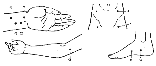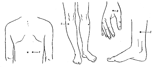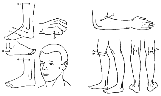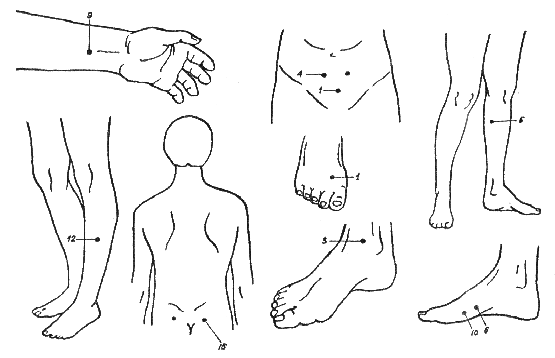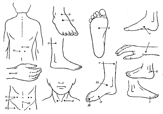 Точка 8. Симметричная, расположена на стопе в углублении между пяточным сухожилием и наружной лодыжкой на линии, проходящей по ее центру. Массируется, точка 4. Точка 9. Симметричная, расположена на 3 мм кнаружи от угла ногтевой лунки мизинца стопы. Больной сидит. Точка массируется одновременно с обеих сторон. Точка 10. Симметричная, расположена на спине на полтора цуня в сторону от задней срединной линии на уровне промежутка между остистыми отростками IV и V поясничных позвонков. Больной ложится на живот, под живот ему кладется подушка. Точка массируется одновременно с обеих сторон. Точка 11. Симметричная, расположена в углублении посредине задней поверхности запястья. Больной сидит, положив на стол руку ладонью вниз. Точка массируется поочередно справа и слева. Точка 12. Симметричная, расположена на наружной поверхности голени на 4 цуня выше центра наружной лодыжки. Больной сидит. Точка массируется одновременно с обеих сторон. Точка 13. Симметричная, расположена на II пальце стопы на -3 мм от угла ногтевой лунки в сторону III пальца. Массируется как точка 12. Точка 14. Симметричная, расположена в углублении на передней стороне голеностопного сустава. Больной сидит. Точка массируется одновременно с обеих сторон. Точка 15. Симметричная, расположена на животе на 2 цуня в сторону от пупка. Больной лежит на спине. Точка массируется одновременно с обеих сторон. Точка 16. Симметричная, расположена на шее на уровне нижнего края щитовидного хряща. Массируется, как точка 14, но очень осторожно, без сильного надавливания. Точка 17. Симметричная, расположена в углублении на самом высоком участке тыльной поверхности стопы. Больной сидит. Точка массируется одновременно с обеих сторон. Точка 18. Симметричная, расположена на животе на 4 цуня в сторону от передней срединной линии на уровне пупка. Больной лежит на спине. Точка массируется одновременно с обеих сторон. Точка 19. Симметричная, расположена на 4 цуня в сторону от передней срединной линии на уровне верхней ветви лобковой кости. Массируется, как точка 18. Точка 20. Симметричная, расположена в углублении на тыльной стороне стопы. Больной сидит. Точка массируется одновременно с обеих сторон. Точка 21. Симметричная, расположена на границе тыльной и подошвенной стороны стопы за головкой I плюсневой кости. Больной сидит. Точка массируется поочередно справа и слева. Точка 22. Несимметричная, расположена на поясничной области спины между остистыми отростками II и III поясничных позвонков. Больной лежит на животе, под живот ему кладут подушку. Точка 23. Несимметричная, расположена на животе на передней срединной линии на 2 цуня ниже пупка. Больной лежит на спине. Точка 24. Симметричная, расположена на 3 мм от внутреннего угла ногтевой лунки большого пальца стопы. Больной сидит. Точка массируется одновременно с обеих сторон. Примечания: 1. Массаж проводится успокаивающим методом (кроме точек 14, 17, 22, 24) с использованием легкого надавливания и вращательного поглаживания. Продолжительность воздействия на каждую точку - 3-5 мин. 2. Массаж точек 14, 17, 22, 24 проводится тонизирующим методом с использованием глубокого надавливания м вращательного поглаживания. Продолжительность воздействия на каждую точку - 0,5-1 мин. 3. Рекомендуется поделить все точки на две группы (с 1-й по 12-ю и с 13-й по 24-ю) и один день проводить массаж первой группы, а дру