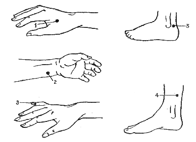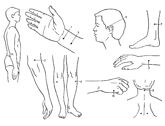 пониженном артериальном давлении рекомендуется проводить массаж Точка 1. Несимметричная, расположена на 5 цуней выше верхней границы волосистой части головы в теменной области. Больной сидит. Точка 2. Несимметричная, расположена на 3 см выше нижней границы волосистой части головы. Больной сидит. Точка 3. Симметричная, расположена на голени на 5 цуней выше внутренней лодыжки. Больной сидит, вытянув ноги. Точка массируется одновременно с обеих сторон. Точка 4. Симметричная, расположена на внутренней стороне руки на 1,5 см ниже нижней складки запястья со стороны большого пальца. Больной сидит, положив руку на стол. Точка массируется большим пальцем поочередно справа и слева. Точка 5. Симметричная, расположена на внешней стороне запястья в углублении, которое образуется при разгибании кисти, между сухожилиями. Больной сидит, положив руку на стол. Точка массируется указательным пальцем поочередно справа и слева. Точка 6. Симметричная, расположена на запястье на одной линии со средним пальцем, в углублении. Больной сидит, положив руку на стол. Точка массируется большим пальцем поочередно справа и слева. ; Точка 7. Симметричная, расположена на внутренней стороне запястья, между сухожилиями. Больной сидит, положив руку на стол. Точка массируется средним пальцем поочередно справа и слева. Точка 8. Симметричная, расположена в конце складки, которая образуется при сгибании руки в локте, со стороны большого пальца. Больной сидит, положив на стол слегка согнутую руку ладонью вниз. Точка массируется поочередно справа и слева. Точка 9. Симметричная, расположена на стопе в месте присоединения пяточного сухожилия к пяточной кости. Больной сидит. Точка массируется одновременно с обеих сторон. Точка 10. Симметричная, расположена под внутренней лодыжкой на границе тыла и подошвы стопы. Больной сидит. Точка массируется одновременно с обеих сторон. Точка 11. Симметричная, расположена на среднем пальце на 3 мм от угла ногтевой лунки в сторону указательного пальца. Больной сидит, положив на стол руку ладонью вниз. Точка массируется поочередно справа и слева. Точка 12. Симметричная, расположена на внутренней стороне запястья со стороны мизинца, в углублении. Массируется, как точка 11. Точка 13. Симметричная, расположена на границе тыльной стороны и подошвы стопы под I плюсневой костью. Больной сидит. Точка массируется поочередно справа и слева. Точка 14. Симметричнад, расположена на внешней стороне предплечья на полтора цуня выше средней складки запястья у шиловидного отростка лучевой кости. Больной сидит, положив на стол руку ладонью вниз. Точка массируется поочередно справа и слева. Точка 15. Симметричная, расположена на голени на 3 цуня ниже коленной чашечки и на 1 цунь кнаружи от переднего края болыпеберцовой кости. Больной сидит, вытянув ноги. Точка массируется одновременно с обеих сторон. Точка 16, Симметричная, расположена на полцуня в сторону от передней срединной линии на уровне верхнего края лобковой кости. Больной лежит на спине. Точка массируется одновременно с обеих сторон. Точка 17. Симметричная, расположена в области грудной клетки в подключичной ямке. Больной сидит. Точка массируется одновременно с обеих сторон. Примечания: 1. Массаж (кроме точки 3) проводится тонизирующим методом с использованием глубокого надавливания с вибрацией. Продолжительнос