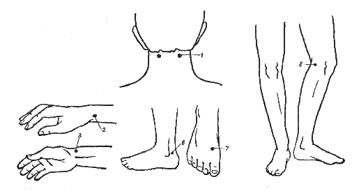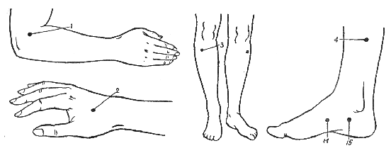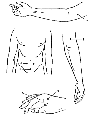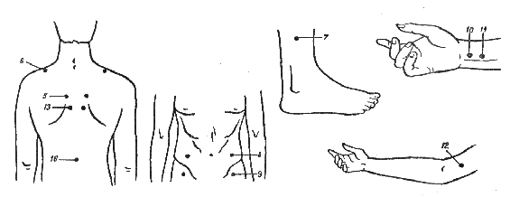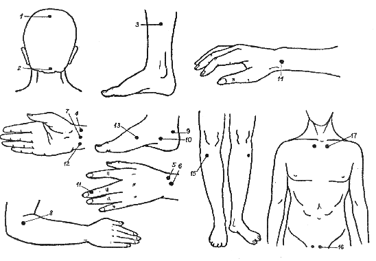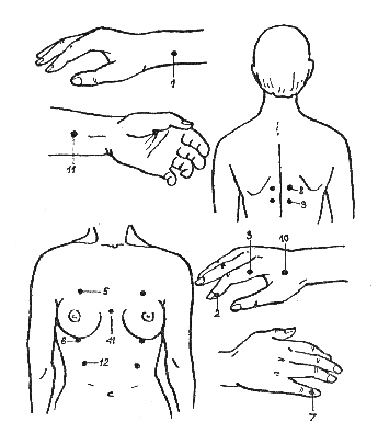 7. Симметричная, расположена на спине под точкой 6 на уровне проме Точка 8. Симметричная, расположена в поясничной области спины на одной вертикальной линии с точками 6 и 7. Массируется, как точка 6. Точка 9. Симметричная, расположена на голени на 3 цуня выше внутренней лодыжки. Больной сидит. Точка массируется одновременно" с обеих сторон. Точка 10. Симметричная, расположена на голени на 5 цуней выше внутренней лодыжки. Массируется, как точка 9. Точка 11. Симметричная, расположена на подошве стопы в небольшом углублении, образующемся при сгибании пальцев. Больной сидит. Точка массируется поочередно справа и слева. Примечания: 1. Массаж (кроме точек 4, 11) выполняется успокаивающим методом с использованием легкого надавливания с вращением, темп которого постепенно замедляется. Продолжительность воздействия на каждую точку - 4-5 мин. 2. Массаж точек 4 и 11 выполняется тонизирующим методом с использованием глубокого надавливания с вибрацией. Продолжительность воздействия на каждую точку - 0,5-1 мин. 3. Особенно хороший эффект дает частое воздействие на точку 11. Во вторую группу входят нижеследующие точки (рис. 59). Точка 12. Симметричная, расположена на предплечье на 1 цунь выше средней складки запястья. Больной сидит, положив на стол руку ладонью вверх. Точка массируется поочередно справа и слева. Точка 13. Симметричная, расположена на внутренней стороне плеча на 3 цуня выше локтевого сгиба. Больной сидит. Точка массируется поочередно справа и слева.