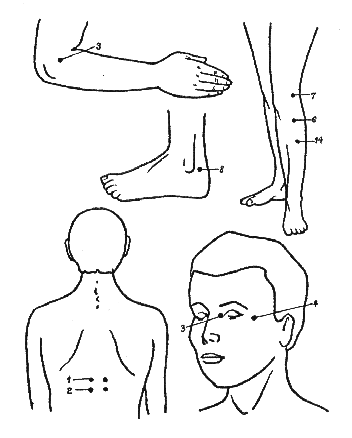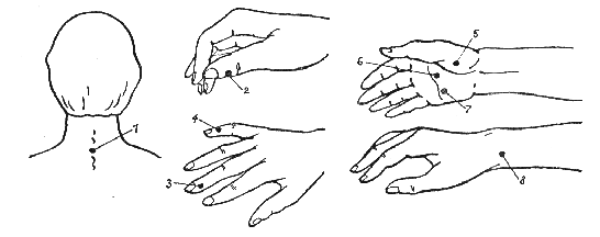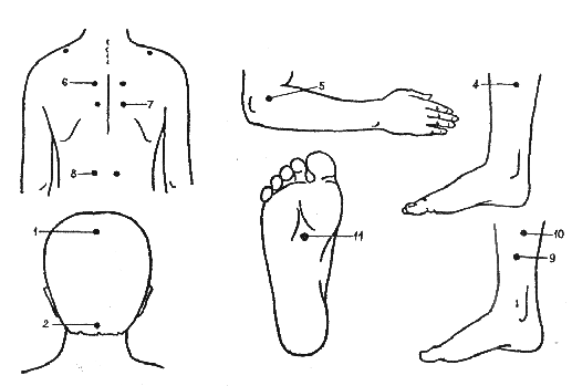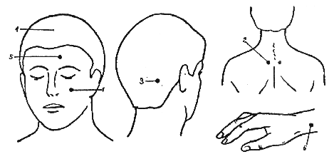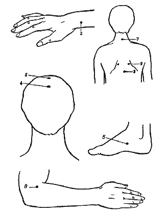 1. Массаж точек 2-6, 9 проводится успокаивающим методом с использованием легкого надавливания. Продолжительность воздействия на каждую точку - 3-5 минут.