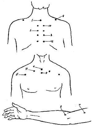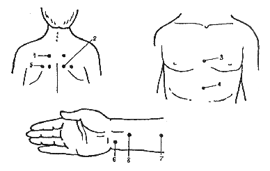 Точка 6. Несимметричная, расположена на передней срединной линии на уровне четвертого межреберья. Больной сидит или лежит на спине.