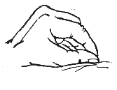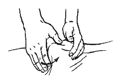 Щипцеобразное разминание. Данный прием применяется при массаже мышц спины, груди, шеи, лица. Щипцеобразное разминание хорошо применять при массировании небольших мышц и наружных их краев, а также сухожилий и головок мышц. Выполнять прием следует большим и указательным пальцами, сложенными в виде щипцов (рис. 97). Можно также использовать большой, указательный и средний пальцы. Щипцеобразное разминание может быть поперечным или продольным. При выполнении поперечного щипцеобразного разминания мышцу нужно захватить и оттянуть. Затем попеременными движениями от себя и к себе мышцу разминать пальцами. Если производится продольное Щипцеобразное разминание, мышцу (либо сухожилие) следует захватить большим и средним пальцами, оттянуть, а затем произвести разминания между пальцами спиралевидно.