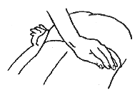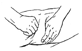 Удобнее делать это разминание, уложив массируемого на плоскую поверхность. Массируемый должен максимально расслабить мышцы. Кисти обеих рук нужно расположить на массируемом участке так, чтобы расстояние между ними было равно ширине кисти. Большие пальцы должны располагаться на противоположной стороне массируемой поверхности от остальных пальцев.