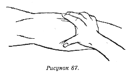 Валяние. Обычно прием используется для массажа мышц плеча и предплечья, бедра и голени. Кроме того, из-за щадящего воздействия валяния его применяют при повреждениях мышечных волокон и сосудов в результате травм, при склеротических поражения сосудов и т. д. Выполняется прием двумя руками. Кистями обеих рук следует обхватить с обеих сторон массируемую область, кисти при этом располагаются параллельно друг к другу, пальцы прямые. Движения каждой руки выполняются в противоположных направлениях, руки следует постепенно перемещать по всему участку массируемой поверхности (рис. 91).