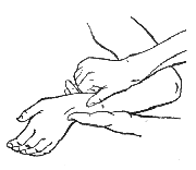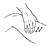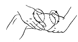 Выполняется прием подушечкой большого пальца таким же образом, как и кругообразное разминание подушечками четырех пальцев, только в этом случае четыре пальца никакого участия в разминании не принимают.