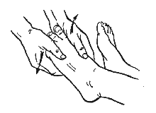 При массаже кисти сдвигание межкостных мышц кисти происходит так. Пальцами обеих рук следует захватить кисть массируемого за лучевой и локтевой край. Короткими движениями ткани сдвигаются по направлению вверх-вниз. Аналогичным способом можно произвести сдвигание мышц стопы (рис. 93).