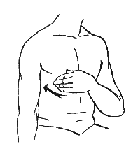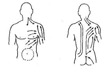 Прежде чем приступить к массажу груди, нужно сесть. Самомассаж груди производится поочередно с каждой стороны. Руку со стороны массируемой половины тела нужно опустить. Пальцами другой руки необходимо погладить половину грудной клетки по межреберным промежутками спереди назад (рис. 142). То же сделать на другой половине груди.