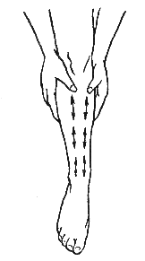 Далее большие пальцы обеих рук нужно расположить на передней поверхности, а ос-тальные - на задней и начать процедуру растирания кругообразными движениями от голеностопного сустава вверх. После этого переднюю поверхность голени нужно растереть большими пальцами продольно. Растирание необходимо производить вверх и вниз на каждом отрезке голени (рис. 137).