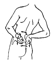 Массируется стоя. Необходимо слегка наклониться назад и произвести поглаживающие и растирающие движения поясничной области обеими руками одновременно. При этом массажные движения могут быть кругообразными, поперечными и продольными (рис. 140).