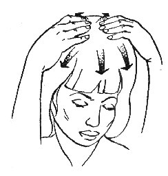 Правой рукой нужно плотно обхватить теменную, а левой -затылочную области. При этом кожу вместе с лежащими под ней тканями необходимо сдвинуть навстречу друг другу. Такие движения нужно произвести по всей поверхности головы. Заключительный этап - массаж шеи.