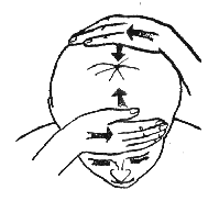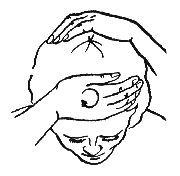 - начиная со лба, большим и указательным пальцами обеих рук необходимо захватить в складки всю толщину тканей в области надбровных дуг и сдавить.
