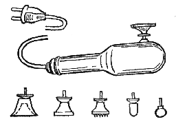 Вибрационный массаж следует про изводить специальными насадками (они входят в комплект прибора). Все насадки разной формы. Четыре из них резиновые (колокол-присос, шиповая, губчатая, ша рик) и одна карболитовая - полущар. Они различаются также по твердости. Первые три - мягкие, последние две - твердые. Массаж мягкими насадками оказывает нежное и поверхностное действие; твер дые применяют для глубокого, сильного массажа (рис. 149). Рисунок 149.