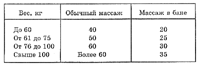 Продолжительность сеанса общего тренировочного массажа составляет в среднем 40-60 мин. Лишь в некоторых случаях, например, у спортсменов с большой мышечной массой, она может продолжаться более часа (табл. 1).