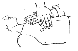 В случае остановки сердца проводится непрямой (наружный) ручной массаж сердца. Массажные приемы выполняются в области между грудным отделом позвоночника и грудиной. Для проведения массажа больного следует положить на спину на твердую поверхность и подложить под его плечи небольшой валик. Массирующему нужно расположиться слева от больного, наложить на нижнюю треть его грудины ладонь левой руки, а поверх нее - ладонь правой руки и выполнить ритмические надавливания в виде толчков(60-70 раз в минуту), быстро снимая ладони после каждого надавливания (это даст грудной клетке возможность расправиться, а сердцу - наполниться венозной кровью) (рис. 159). Надавливание рекомендуется делать в таком порядке: