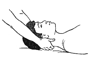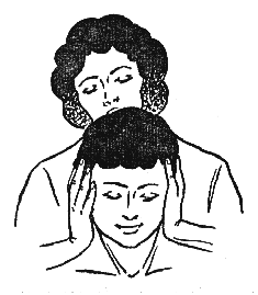 Необходимо встать у изголовья пациента и одной рукой взять его за подбородок, а другой обхватить затылок (рис. 225). Колени выполняющего прием должны быть слегка согнуты, а стопы параллельны.