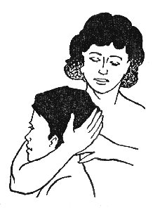 Необходимо встать вплотную к больному и положить локти на его плечи, а ладони расположить чуть ниже ушных раковин (если нужно воздействовать на верхние сегменты шейного отдела позвоночника) (рис. 223). Для воздействия на средние и нижние сегменты шейного отдела ладони нужно опустить чуть ниже, приложив основания ладоней на поперечные отростки второго шейного позвонка.