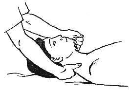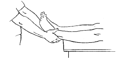 3. Следующий прием выполняется в положении пациента лежа на спине. Если прием выполняется с помощью ассистента, он должен зафиксировать ноги больного в лодыжках. Если ассистента нет, пациент должен лечь таким образом, чтобы его ноги были согнуты в коленных суставах, а голени свисали с кушетки.