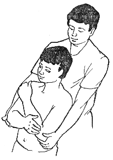 Пациент садится на кушетку, скрестив руки на груди и обхватив кистью левой руки правый плечевой сустав, а кистью правой руки - левый плечевой сустав. Врач должен встать за спиной пациента и захватить его локтевые суставы (рис. 228).
