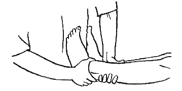 Врач, проводящий прием, должен встать у ног пациента. Пациенту необходимо упереться носками в бедра врача.