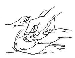 Для выполнения процедуры необходимо левой рукой поддерживать ногу ребенка в области голени. Чтобы создать для стопы опору, следует подложить на ее тыльную часть 2 пальца правой руки. Массаж нужно делать при помощи круговых движений большого пальца правой руки таким образом, чтобы он описывал восьмерку (рис. 262).