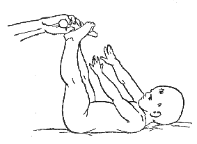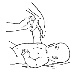 После этого следует провести большим пальцем по внешнему краю стопы по направлению от мизинца к пятке и слабо нажимать на подошву. В этом положении ребенок будет рефлекторно разгибать пальцы ног.