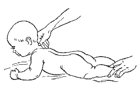 Процедура массажа начинается с нескольких поглаживаний. Затем следует приступить к растиранию. Его следует делать ладонями и кончиками пальцев. Выполнив растирание, следует вернуться к поглаживанию. После очередного поглаживания нужно перейти к пилению, которое выполняется ребрами ладоней. После нескольких движений кожа ребенка должна слегка покраснеть. Процедуру пиления необходимо закончить поглаживанием. В заключение процедуры необходимо сделать несколько щипцеобразных разминаний ягодиц и длинных мышц спины, которые, как и предыдущие приемы массажа, должны закончиться поглаживаниями. Все приемы массажа следует повторять по 3 раза.