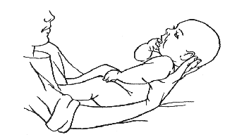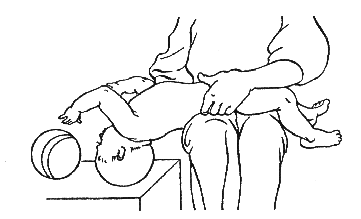 И. п. - на руках массажиста, причем подбородок ребенка должен быть прижат к груди, ноги согнуты и подтянуты к