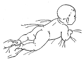 Данное упражнение рассчитано на безусловный рефлекс ребенка, связанный с раздражением мышц спины, в результате которого происходит работа мышц-сгибателей и мышц-разгибателей. Этот рефлекс является врожденным и остается у человека до конца жизни. Процедура способствует укреплению мышц спины. Ее рекомендуется делать 2-3 раза в день.