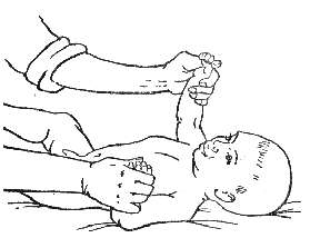 Для выполнения процедуры следует левой рукой поддерживать ногу ребенка, а большим пальцем правой руки слегка нажимать на стопу у основания пальцев. В этом случае, ребенок будет рефлекторно сгибать стопу (рис. 263).