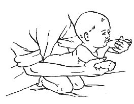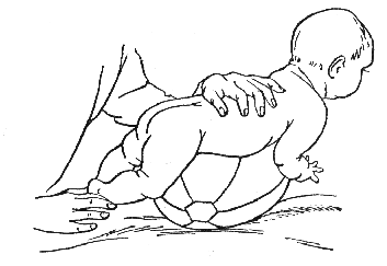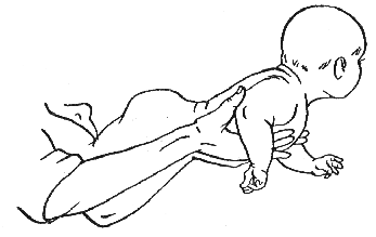 Осторожно, но энергично согнуть ноги ребенка, а через 1-2 секунды - разогнуть. После выполнения этого движения 3-4 раза, ребенок оттолкнется от рук массажиста и самостоятельно поползет (рис. 295). Когда ребенок привыкнет к упражнению, сгибание ног нужно будет проводить не одновременно, а поочередно.
