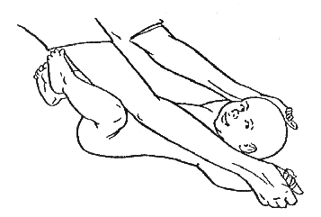 Упражнение способствует развитию у ребенка навыка ползания. Для его выполнения следует большим и средним пальцем взять ребенка за пятки. При этом указательный палец массажиста должен находиться между ступнями малыша.