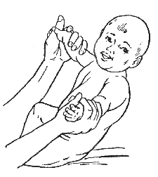 Упражнение способствует развитию мышц спины и живота. Для его выполнения следует вложить большие пальцы массажиста в ладони ребенка и заставить его сжать кулачки. Остальными пальцами нужно поддерживать ребенка за запястья.