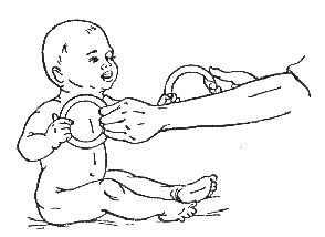 В возрасте 4-х месяцев у ребенка появляется интерес к различным игрушкам. Он все чаще берет их в руки и пытается их удержать. Родители должны способствовать развитию этого интереса, так как при захвате игрушек у малыша развиваются и укрепляются суставы и мышцы рук. Чтобы это развитие происходило без осложнений, рекомендуется покупать ребенку погремушки с удлиненной круглой ручкой. Кроме того, необходимо следить, чтобы ребенок во время игры отставлял большой палец. В 3-месячном возрасте, у детей, как правило, исчезает гипертонус мышц-сгибателей рук, а в 4 года - мышц-сгибателей ног. В этом возрасте можно начать различные пассивные упражнения, укрепляющие мышцы-сгибатели рук и ног. В первое время они достаточно простые и легкие, но постепенно должны становиться все более и более сложными.