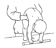 И. п. - стоя на ногах. Для выполнения процедуры необходимо взять ребенка подмышки и повернуть спиной к себе. Это упражнение нужно проводить на столе или на любой твердой поверхности. Малыш должен опустить ножку и дотронуться пяткой до стола. При соприкосновении с твердой поверхностью он начнет перебирать ногами, как при ходьбе. Массажист должен следить за тем, чтобы ребенок опирался то на одну ногу, то на другую (рис. 264).