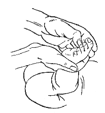 2. И. п. - то же. Нужно произвести кольцевое растирание: следует вложить большой палец в ладонь ребенка, остальными - придерживать его кисть. Большим и указательным пальцами другой руки обхватить руку ребенка и, делая растирающие движения, продвигаться от кисти к плечу по внутренней поверхности предплечья и наружной поверхности плеча.