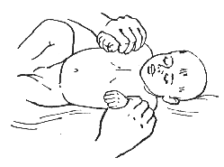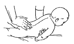 2. И. п. - ребенок лежит на спине. Необходимо совершать ритмичные надавливания на грудную клетку, ее передние и боковые поверхности, обходя грудину.